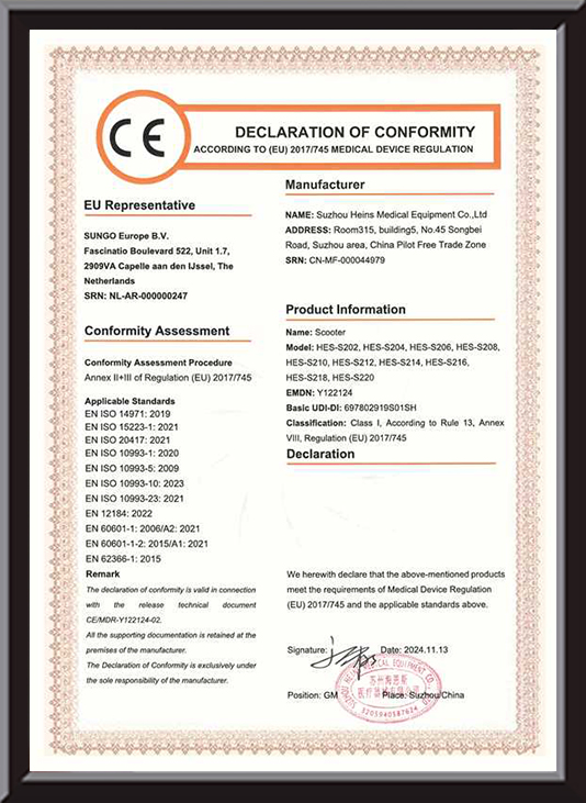 Although the lightweight portable electric scooter has excellent waterproof and safety performance, users still need to pay attention to some matters when using it on rainy days or slippery roads. First, you should avoid driving on roads with deep water for a long time. Although the Heins Medical Equipment scooter has good waterproof performance, too much water may still cause damage to parts and affect the service life of the vehicle. Secondly, you should reduce the speed appropriately during driving, maintain a safe distance, and reserve sufficient braking distance. The braking distance on wet and slippery roads will be longer than on dry roads, so users need to drive more carefully and avoid dangerous operations such as sudden acceleration and sudden braking. In addition, cleaning and drying the vehicle in time after use will help extend the service life of the vehicle and maintain good performance. Users can wipe the body with a clean soft cloth to remove rainwater and mud. For some parts that are prone to water accumulation, such as the basket and pedals, special attention should be paid to cleaning to ensure that the vehicle remains dry and clean.